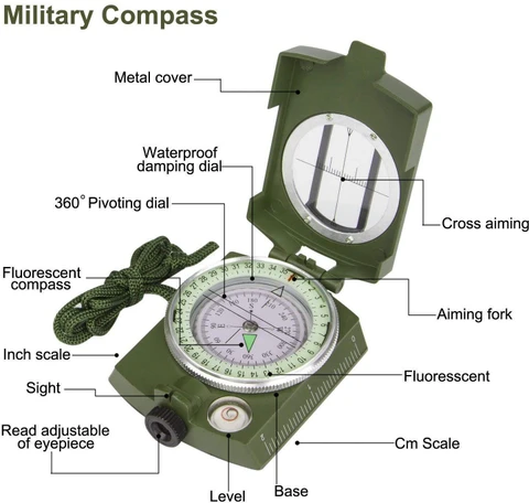 - Optical Sighting Lens: Features a sighting hairline and magnifying lens for high-precision azimuth readings and map orientation.