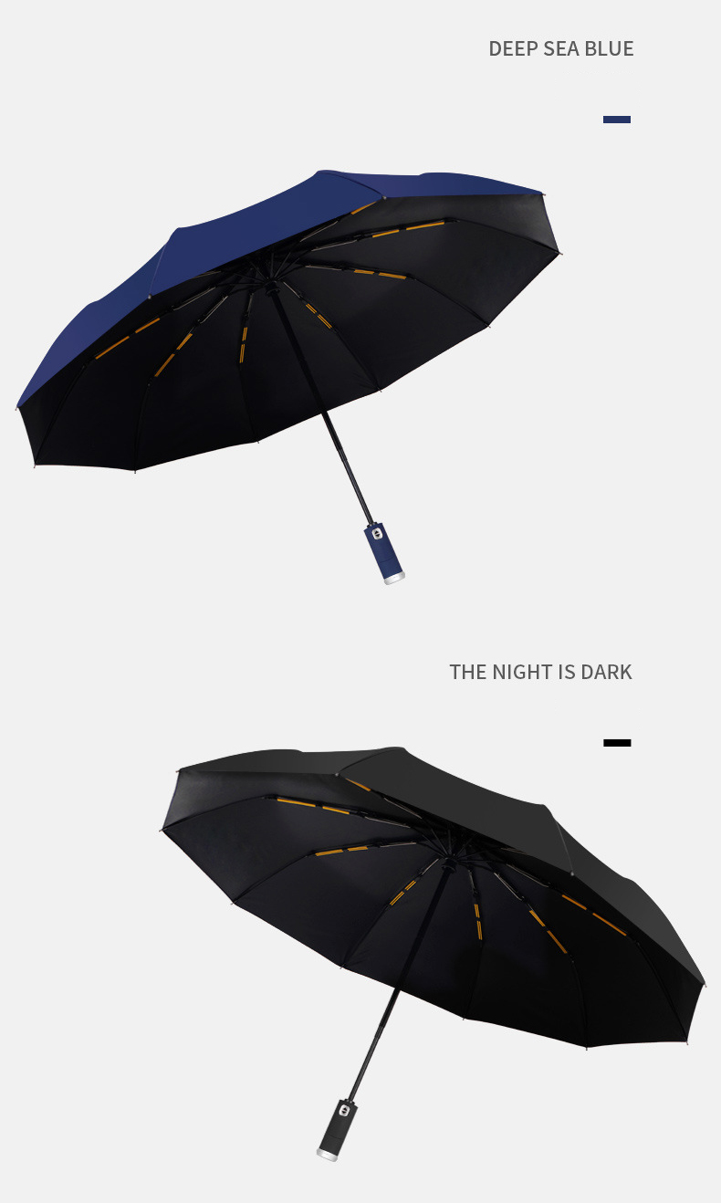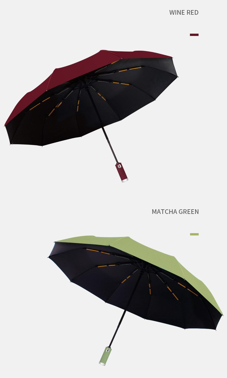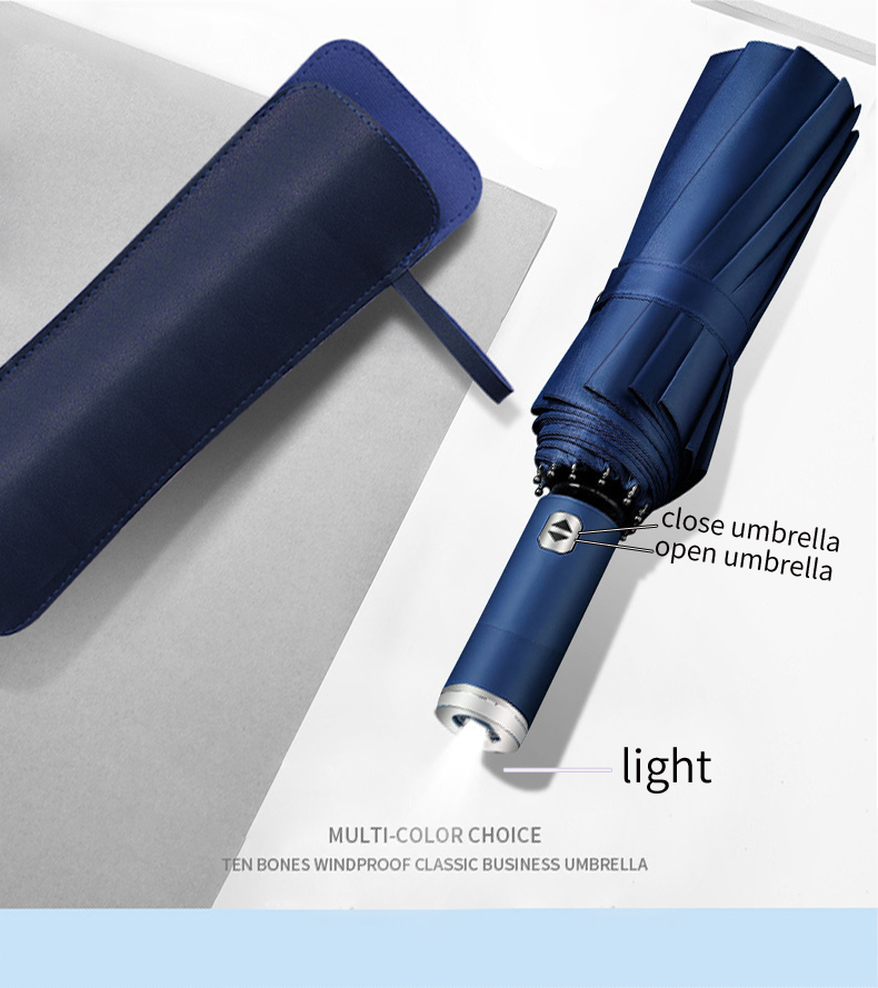 Premium fully automatic 10-rib windproof umbrella with integrated LED flashlight and reverse folding design. Available in Red, Black, and Blue.